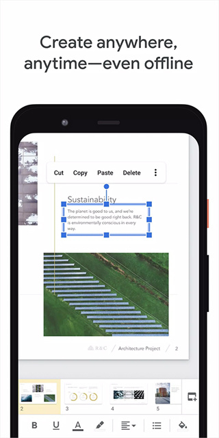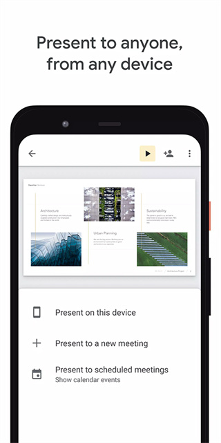 谷歌幻灯片由谷歌官方制作的幻灯片演示软件,创建一个新的演示文稿,并添加文本、图片、图表、视频等元素打造想要的演示文稿。无论何时何地,用户都可以通过手机或平板电脑随时访问和编辑演示文稿。