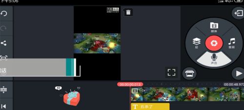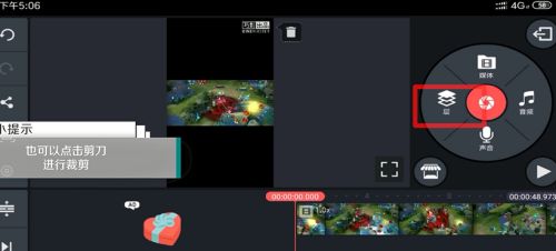 3、把视频拖到时间轴上后,可以拖动黄色的边框来裁剪时长。如果想加文字,就选择“层”功能,再点击那个“T”字图标。