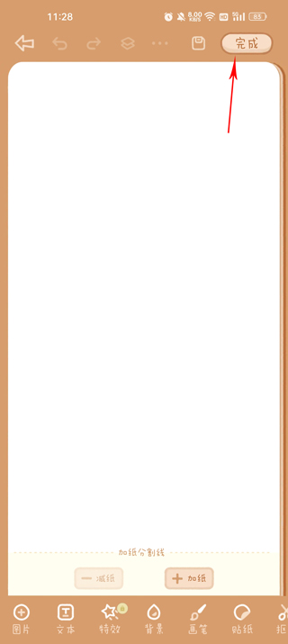6、在编辑界面,你可以自由地插入手机里的照片、更换背景图、输入文字以及添加各种可爱的贴图。所有内容编辑妥当后,点击右上角的“完成”即可保存。你还可以将完成的作品分享到QQ、微信、朋友圈等各大社交平台,与朋友们分享你的生活点滴。