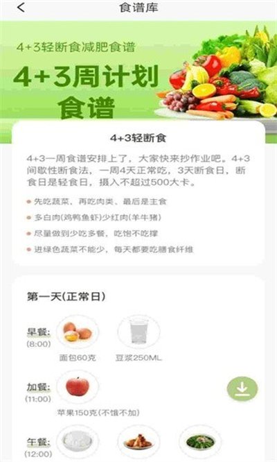 2、切换到“食谱”板块,你会发现这里为你准备了超多样的瘦身饮食方案,像是针对大体重人群的专门食谱,或是流行的“4+3轻断食”餐单,帮你吃得健康、瘦得科学。