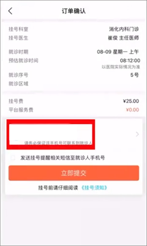 5、最后一步就是确认订单信息了。仔细核对一下预约的医生、时间是否正确,然后添加就诊人的信息,填好联系电话。确认无误后,点击提交并完成支付,一次成功的线上预约就完成了。