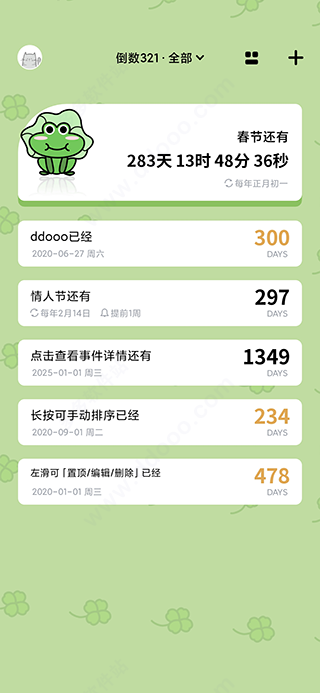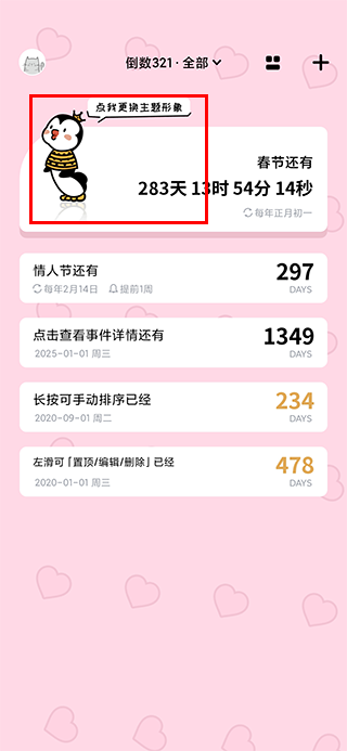 总是忘记重要的日子?那么就配合倒数321app来进行使用吧,这不仅是一款可以完美帮助用户记录生活中重要日子的倒计时app,还是非常粉嫩可爱的日期记录功能应用软件,在这里用户可自己的根据自己的喜好来选择蜜蜂、萌鸭、小熊、孤寡孤、大鹅、兔叽叽、狐狸、麋鹿等多种可爱的卡通动物形象设置为软件背景,整体画风十分的Q萌可爱。同时不要以为软件的只有画风吸引人,其功能也是非常丰富功能,在倒数321软件中提供了正数日、记录纪念日、生日、传统节日等各种你关心的日子自定义设置添加,以便更好的可在第一时间及时提醒你,而且还支持用户将倒计时和纪念日随意的设置到手机桌面上、通知栏、锁屏上等多处,这样就能更好的随时随刻提醒用户啦,非常的实用,欢迎有趣的用户们自行下载免费体验。