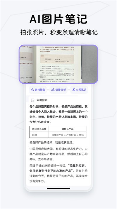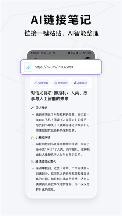 不只是语音,它处理各种信息的能力也很全面。比如你在网上看到一篇深度好文,但没时间细读,只需要把链接复制过来,AI就能迅速帮你提炼出文章的核心观点和摘要,直接存为一条笔记,方便你日后回顾。