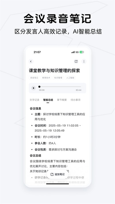 2、学习笔记:不管是记录老师的课堂讲授,还是整理线上课程的要点,它都能帮你把语音和各种资料高效地转化为结构化的文字笔记。