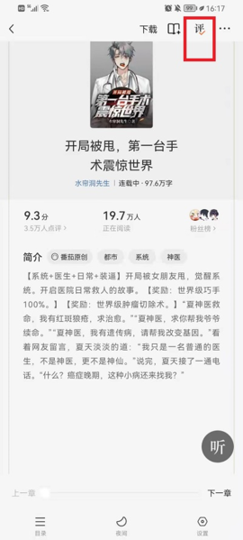 3、在弹出的功能菜单里,你会看到顶部有一个【评】字样的按钮,点击它,就能让书本内容中的评论显示出来。