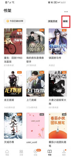 2、在书架页面的右上角,你会看到一个【编辑】按钮,点击它,书架就会进入编辑模式。