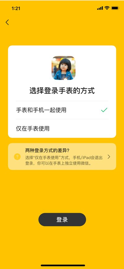1、你可以用自己已有的微信账号来登录手表,并且能自由选择让手表独立运行微信。