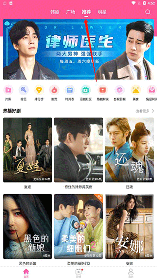 1、打开韩站app,你会看到主界面底部有四个清晰的导航栏,分别是“韩剧”、“广场”、“推荐”和“明星”。在“韩剧”板块,你可以找到当前最火爆的剧集,还有像“精选热剧”、“青葱少年时”等精心策划的专题分类。