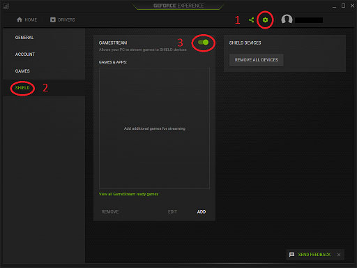 3、进入该页面后,手动将“GAMESTREAM”的开关拨到开启状态。如果你在设置里找不到“SHIELD”这个选项,那可能是因为你的显卡型号太老,不支持此功能。一般来说,需要GTX 600系列或更新的显卡才行。
