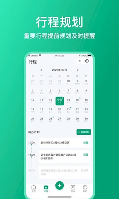 3、举个例子,点击“行程”选项,再按“添加”按钮,就能把未来的重要事项记下来,到了设定时间,应用会自动发出提醒。