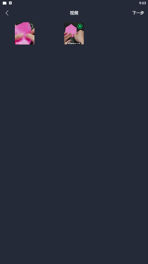 2、点进去之后,它会让你从手机相册里选视频。选好你要处理的那个,然后点右上角的“下一步”按钮。