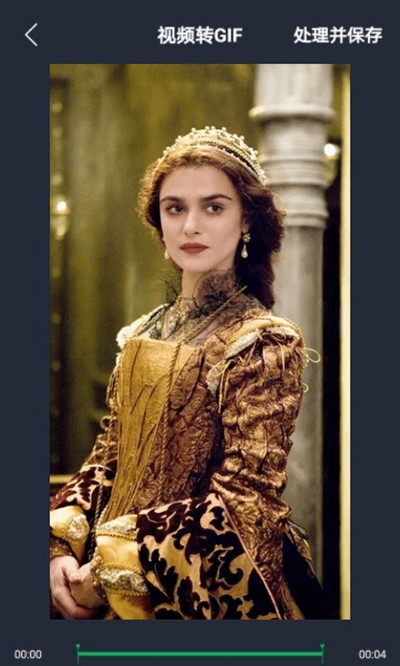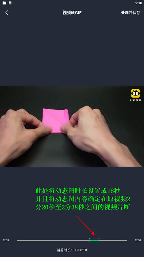 3、这个界面底下有个进度条,看到截图里这个界面没,两头可以拖动,用来框选你要做成GIF的片段。选好时长和内容之后,直接点右上角的“处理并保存”。