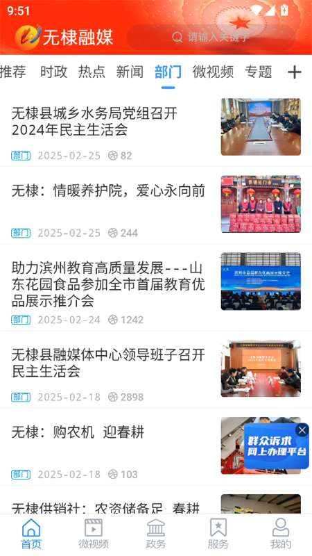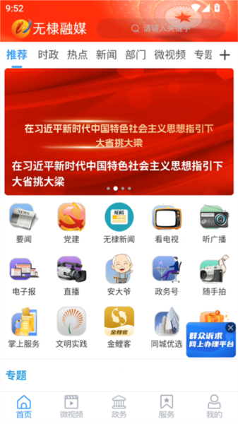 1、进入应用首页,你就能看到包括时政、热点、新闻、部门、微视频、专题在内的一系列清晰板块。