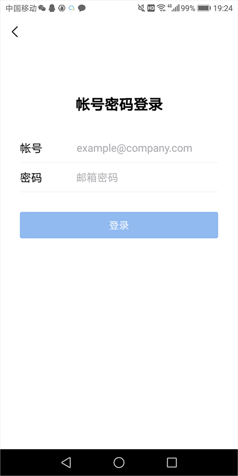 3、当然,你也可以选择点击【账号密码登录】,然后输入你已经和企业微信绑定的邮箱账号来完成登录。