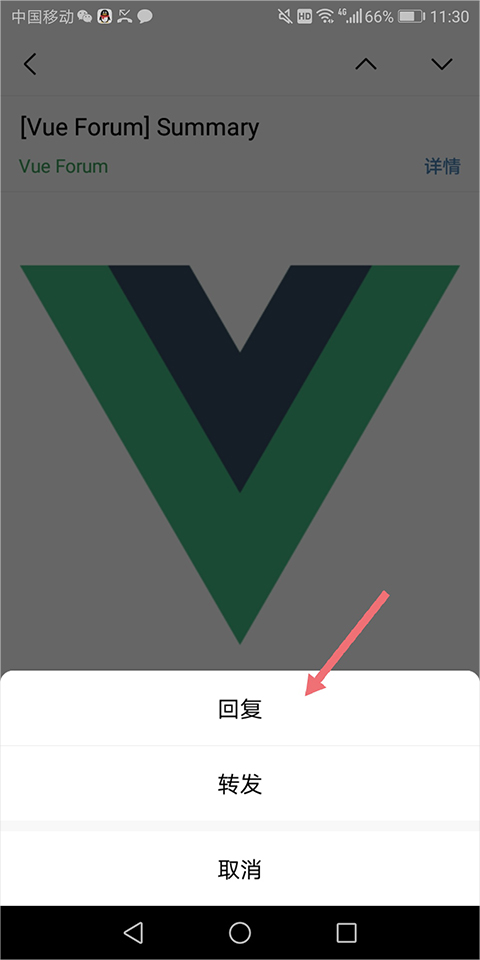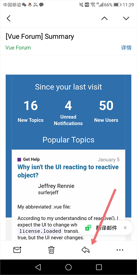 3、进入邮件详情页后,注意看右下角,会有一个看起来像“转弯箭头”的图标,这就是回复按钮,点击它。