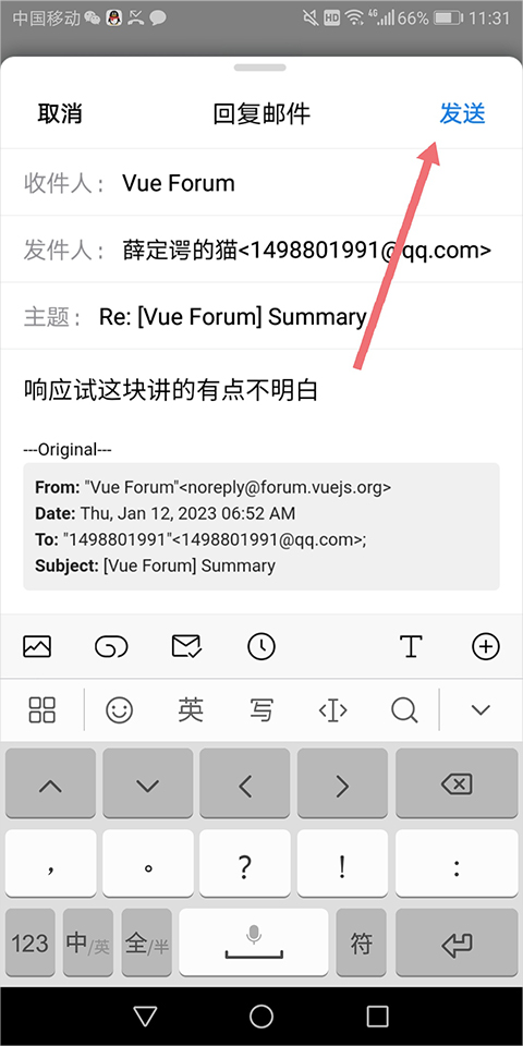 5、最后,在新的编辑页面里输入你的回复内容,检查无误后,点击右上角的“发送”按钮,这封回复邮件就成功发出去了。