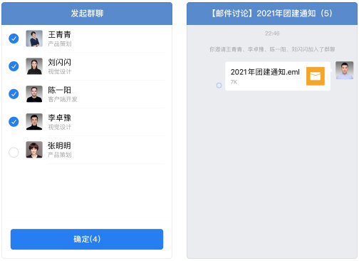 2、 针对某一封邮件,你可以直接向这封邮件的收件人和发件人发起一个即时群聊,大家可以围绕邮件内容快速展开讨论,沟通效率更高。
