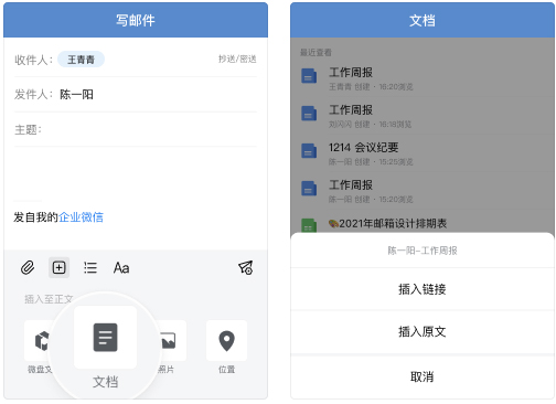 写邮件时,可以随手插入聊天记录、在线文档、微盘里的文件或是日程安排,甚至能直接把文档内容复制到邮件正文里,让邮件内容的组织和呈现更加高效。