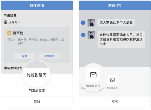 3、 在群聊中讨论的重要内容和结论,可以方便地整理并添加到邮件里,这样既能作为会议纪要存档,也便于分享给其他相关人员。