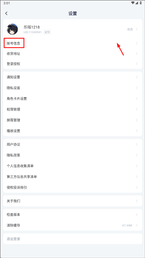 2、在设置菜单里,找到并选择“账号信息”这一项。