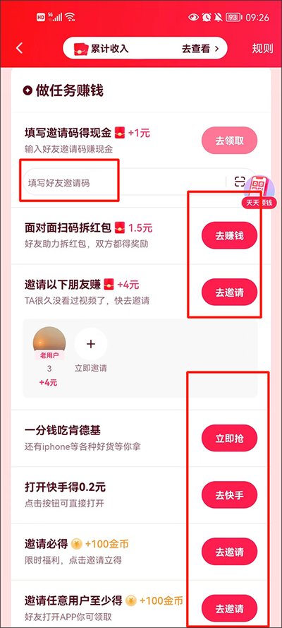 2、不用担心红包不够多,应用内设计了许多赚钱的小任务,比如邀请好友加入、填写朋友给你的邀请码,都能让你轻松获得现金奖励。