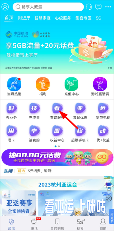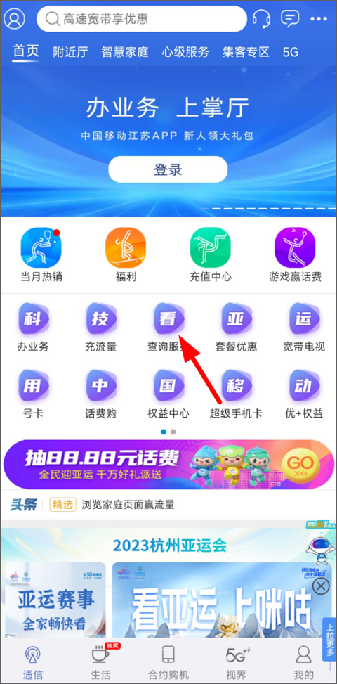 1、打开并登录中国江苏移动App,在默认的“通信”首页,你留意一下上方那排功能快捷入口,从中找到“查询业务”并点击。