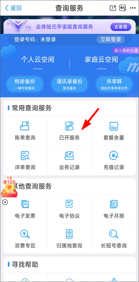 2、跳转到查询服务页面后,这里能查的东西还挺多,比如套餐还剩多少、账单详情等等。你的目标是找到“已开业务”这一项,然后点进去。