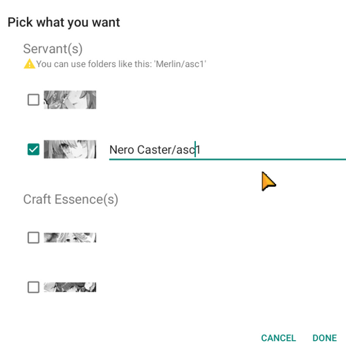 举个例子,对于从者图像,你可以使用类似“Nero/asc1”这样的格式来命名。完成此操作后,系统会将名为“asc1.png”的图片文件存放到“FGA/support/servant/Nero”这个路径下。。。