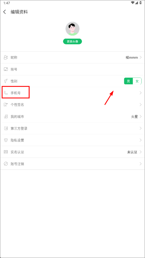 2、在编辑资料的页面里,找到“手机号”那一栏,点右边的那个小箭头。