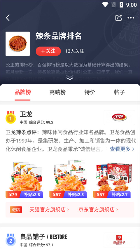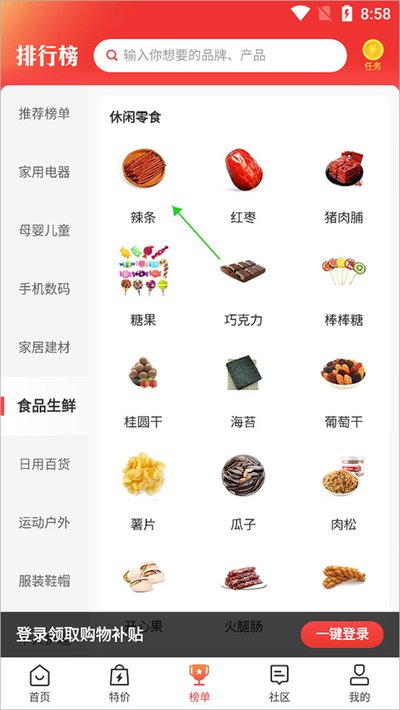 1、刚打开APP,主界面就是榜单,想查啥直接按分类找。比如你想看看辣条哪个牌子牛,就戳那个【食品生鲜】。