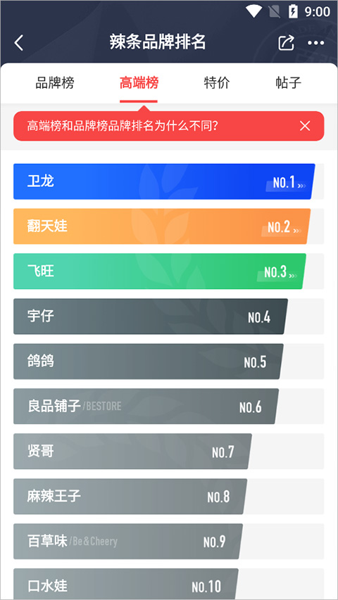 3、然后辣条的品牌排行榜就出来了,一目了然。