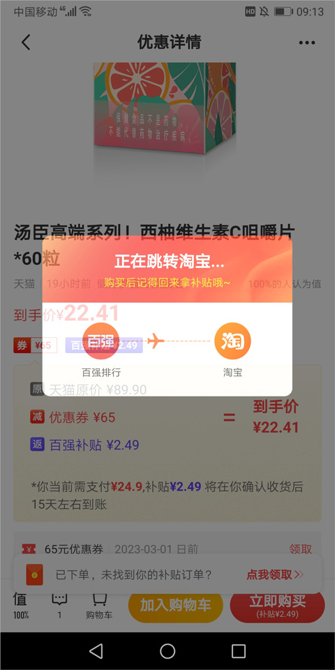 2、你点一下这个按钮,它就会直接把你带到淘宝APP里去下单付款,操作很顺畅。