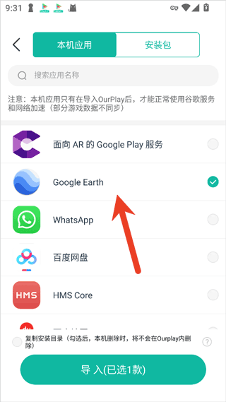 3、当然用户也可以在本站下载ourplay app,这个app中自带谷歌框架,用户只需要将本站下载好的谷歌地球app导入到这个app中就可以正常使用了,导入的方法也十分简单,ourplay app提供导入本机app的功能,用户先在手机上安装好在本站下载好的谷歌地球app后,然后就像使用虚拟机一样导入进ourplay app中即可正常运行