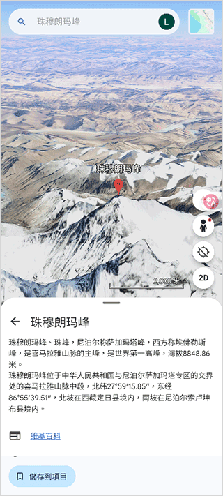 搜索: 点击屏幕顶部的搜索栏,输入地点名称(如“艾菲尔铁塔”、“珠穆朗玛峰”或某个具体地址),应用会立即带你前往该地点。