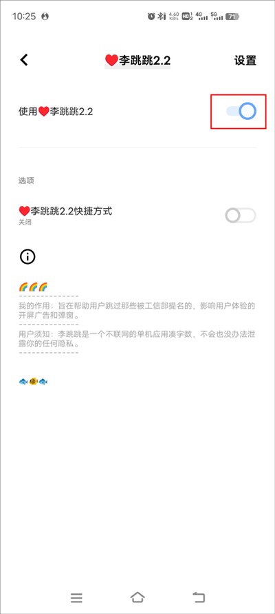 李跳跳(MissLee)是一款专注于自动跳过应用开屏广告的工具类软件,能够有效减少广告干扰,提升使用体验。软件通过无障碍权限实现广告识别与自动跳过,无需Root即可运行,对普通用户较为友好。支持在后台持续运行,并可开启自启动功能,实现全程自动化处理,无需频繁手动操作。在实际使用中,应用可适配多种常见软件的开屏广告,如音乐、视频及社区类应用等,跳过速度较快,使用体验流畅。同时,软件体积小巧、界面简洁,不会对系统造成明显负担。此外,李跳跳还支持自定义规则,用户可根据个人需求添加或调整跳广告逻辑,使功能更加灵活。总体来看,这是一款功能明确、操作简单的去广告工具,适合希望减少广告干扰、提升手机使用效率的用户。