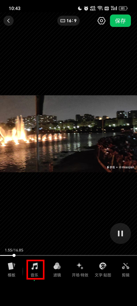 4、一个出彩的视频少不了一段恰到好处的背景音乐。点击下方的“音乐”选项,建议先关掉视频的原始声音,然后在曲库里寻找或搜索一首与视频氛围相符的BGM。