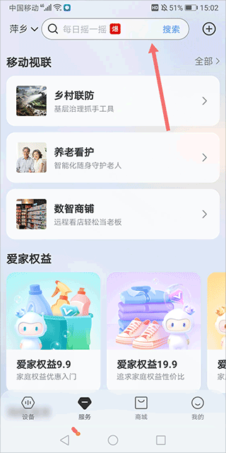 1、打开并登录应用后,切换到‘服务’界面,然后点击页面顶部的搜索框。