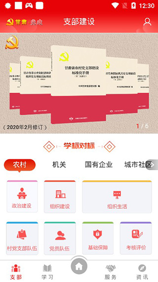 2、来到支部界面,可以看到政治建设、组织建设、组织生活等功能,点击这些功能我们可以查看一些建设标准。