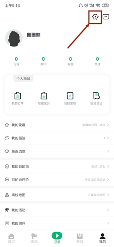 有时候我们想把轨迹导出来用别的软件打开,也很简单。打开六只脚app,进到个人信息那个界面,看到右上角那个小齿轮图标了嘛?点它。