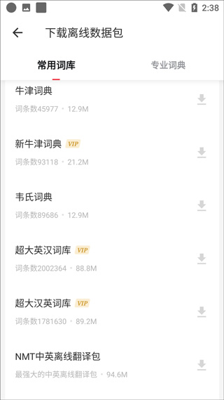 3、进入离线词典管理界面后,你可以看到两大类可供下载的资源:一类是满足日常使用的“常用词库”,另一类是针对特定领域的“专业词典”。