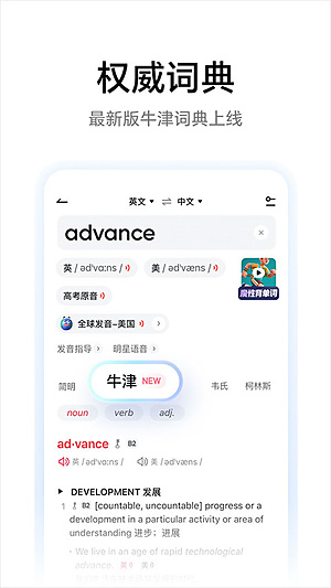除此之外,最新版本的有道词典app在查词体验上做了进一步创新,它的划词翻译功能引入了“指点”释义的概念。这意味着当你查询一个词时,得到的不再仅仅是基础的翻译,应用还会为你呈现与之相关的新闻、影视作品、百科条目、人物介绍等丰富信息,让你的认知更加立体。特别是它的摄像头取词功能,堪称懒人福音,遇到不认识的单词,只需用手机摄像头对准它,无需任何手动输入,精准的释义就会立刻呈现出来,让随时随地学习和背单词变得前所未有的轻松便捷。