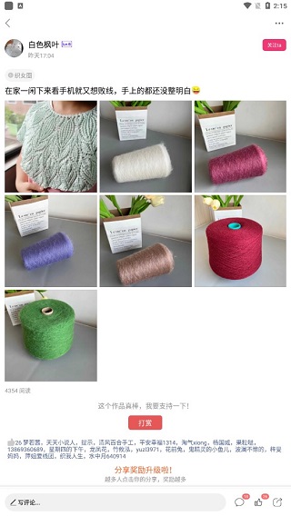 回到首页,你在不同的分类标签下能看到海量的手工作品。随便点一个进去,可以关注你喜欢的作者,还能写评论、参与讨论,或者点赞、打赏、转发一条龙。