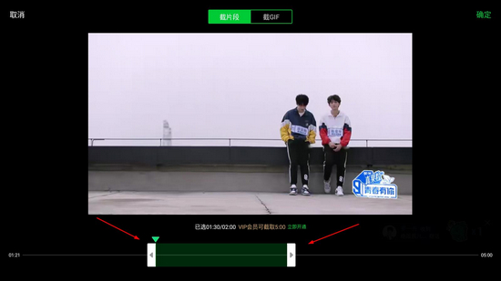 2.点击这个摄影机图标,你就会进入视频片段截取的功能界面。在这里,你可以自由选择你喜欢的片段进行截取,不过需要注意的是,只有VIP会员才能截取长达5分钟的片段。