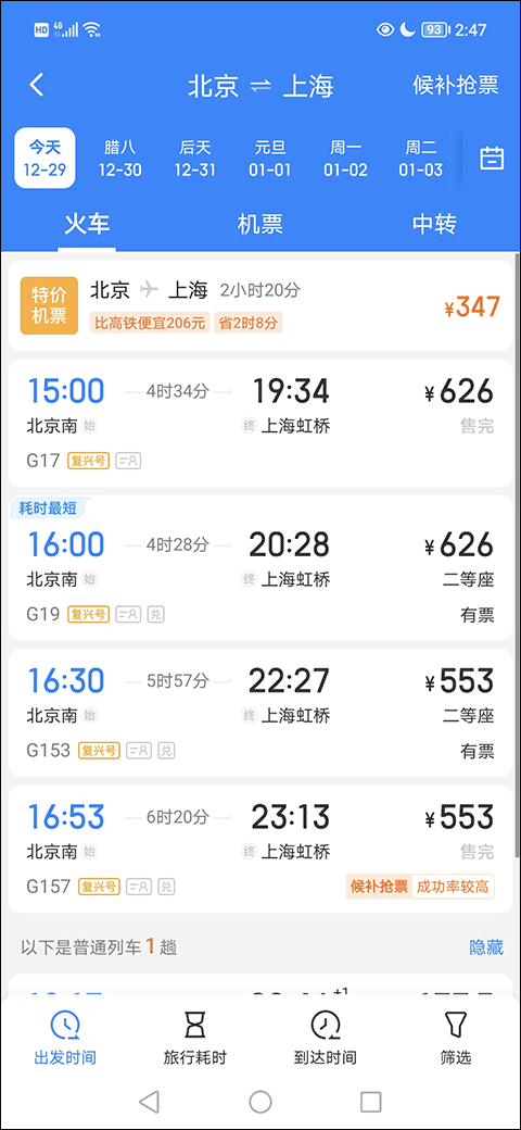2、在车票列表中选择有票且符合需求的车次。