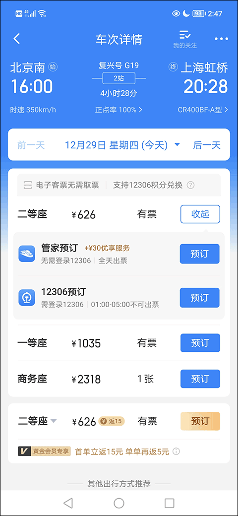 3、进入车次详情页面,点击“预订”。