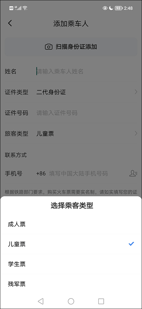6、填写姓名、证件号码,并在“旅客类型”中选择儿童票(也可选择成人票、学生票等),填写手机号后点击添加即可完成。