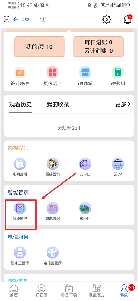一、先打开i视App,在主页找到那个叫“魔镜魔方”的区域,然后点进去找“智能监控”。大家看下面这张截图,就是这个地方。