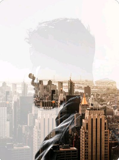 4、然后就是调整图层的上下顺序,把城市那张照片拖到中间那层,再把它的透明度调到40%左右,朦胧感就出来了。