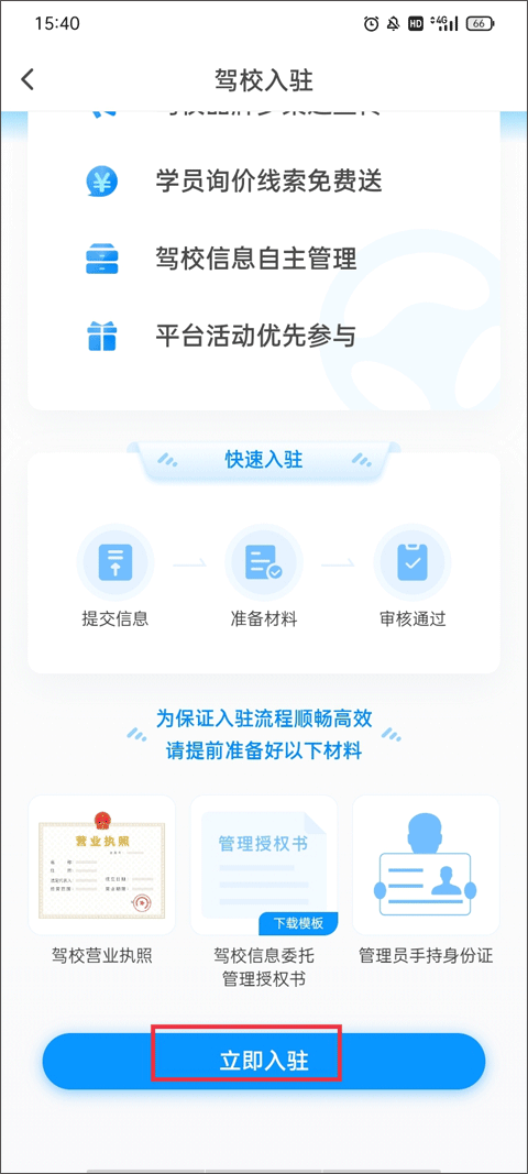 2、进去之后先看看入驻的流程和需要准备的材料,心里有个数,然后点最下面的“立即入驻”就行。