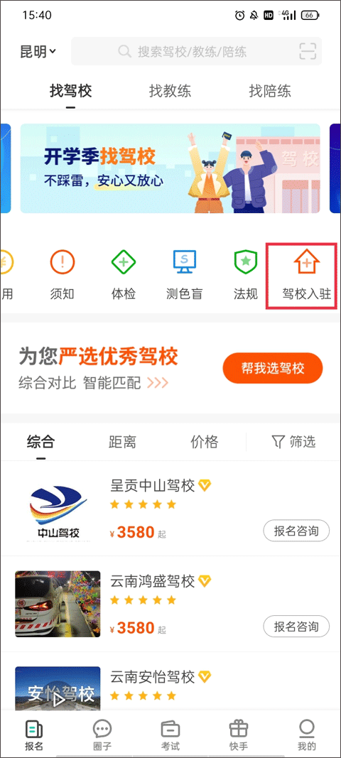 1、打开APP,在【报名】那个页面,能看到一堆功能,比如费用、须知、体检啥的,你往里找,点一下“驾校入驻”。